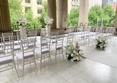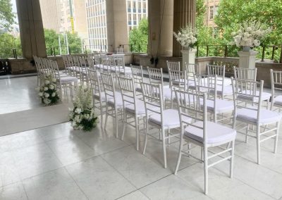 Fresh flowers provided by the florist were placed on pedestals provided by the Melbourne Town Hall. Another 2 x arrangements were placed in front of the chairs on the ground on either side of the white carpet runner aisle. This now completed the ceremony setup and masterpiece look.